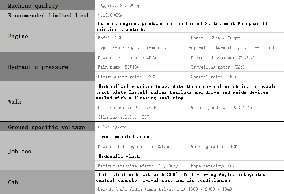SLC35 amphibious transport equipment is a fully hydraulic crawler amphibious transport machine composed of floating tank walking device, cargo platform, truck crane, hydraulic winch and other working tools. Including power system, hydraulic system, operation and monitoring system, walking system, loading and operating system, etc., from front to back, hydraulic winch, cab, power cabin, truck crane, and load platform on both sides.
